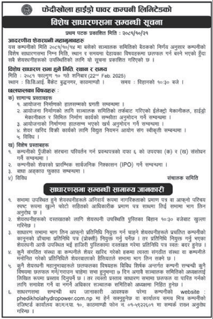 Phedikhola Hydropower Company Limited has announced its SGM going to be held on 10th Falgun, 2081.